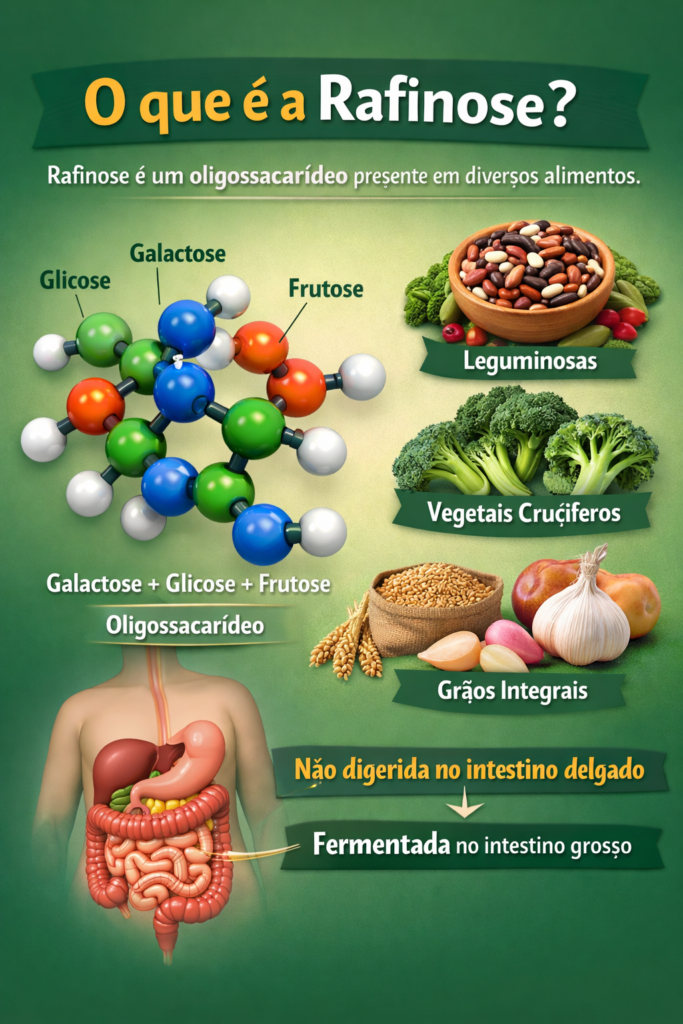 A rafinose é um carboidrato do grupo dos oligossacarídeos, naturalmente presente em alimentos como leguminosas, vegetais crucíferos e grãos integrais. Ela não é digerida no estômago nem no intestino delgado e depende de uma enzima específica para ser quebrada.